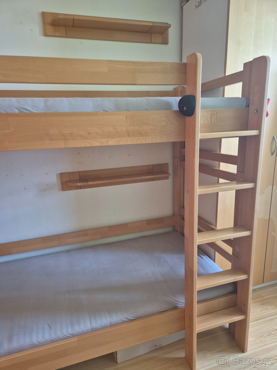 Prodám patrovou postel Lucas z bukového masivu 90x200 cm včetně laťkových roštů (20 lamel) a dvou poliček. Na rozdíl od ostatních materiálů jako dřevotříska, borovice nebo smrk poskytuje buk dlouhou životnost a zejména pevnost konstrukce. Postel nabízí vysokou nosnost 2x130 kg, možnost rozložení na dvě lůžka a zdravotně nezávadný lak. Žebřík lze umístit vlevo nebo vpravo. Česká výroba. Ideální volba do dětského nebo studentského pokoje. Matrace nejsou součástí prodeje. Úložné prostory lze doobjednat u výrobce. (Původní cena nové postele včetně roštů 23.400,- Kč.).