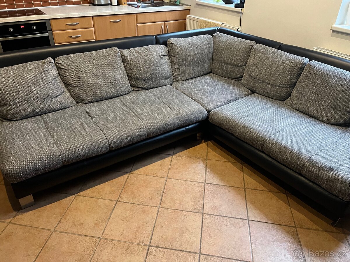 Prodám gauč, rohovou sedačku do L. Použitý starší, ale ještě poslouží. Černá koženka + látka. Ze tří dílů. Koženka se neloupe, trhlina viz foto.