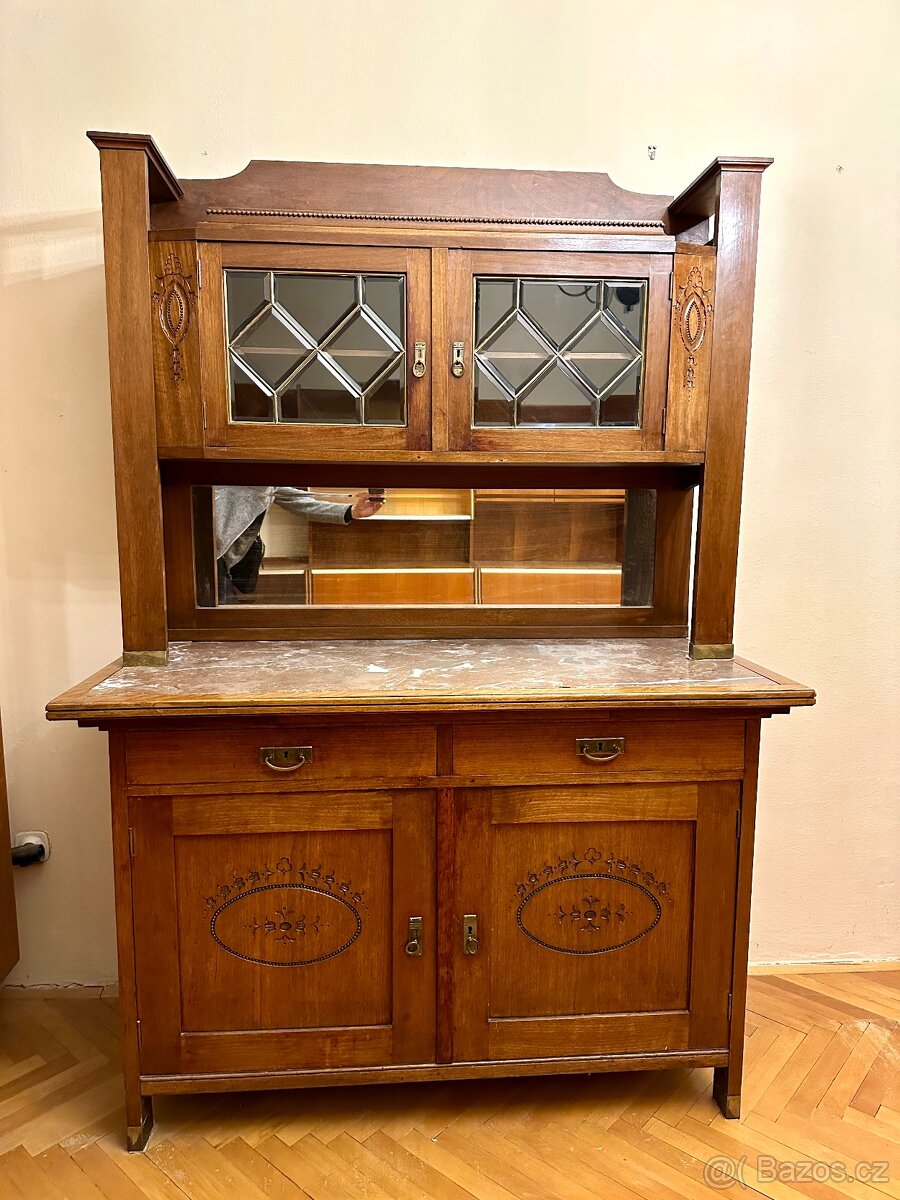 Prodám starožitný příborník s mramorovou deskou. Příborník má horní a dolní část s funkčními zámky.