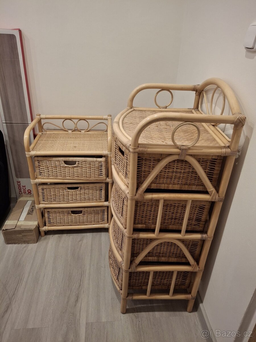 Ratanová sedací souprava 3+1 - [28.1. 2026]Prodám ratanovou sedací soupravu: 1x dvousedák (š 125 cm, h 82 cm, v 78 cm), 2x křeslo (š 72 cm, h 82 cm, v 78 cm), 1x stolek ovál (sklo + police) 57 x 105 cm a výška 45 cm, 2x stojan na kytky, 1x stojan na noviny. Cena komplet 4 999 Kč.