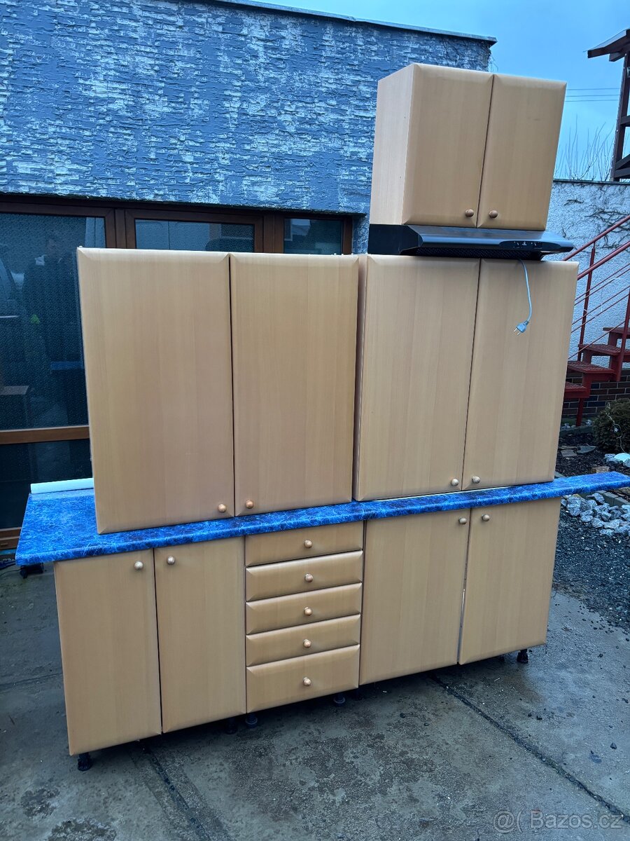 Prodám kuchyňskou linku o rozměrech: foto 1: spodní skříňky 90, 45, 60 cm. Vrchní skříňky 90, 90, 60 cm. Foto 2. Vrchní skříňky v – 75, 45, 45 cm. Součástí linky je pracovní deska a dřez