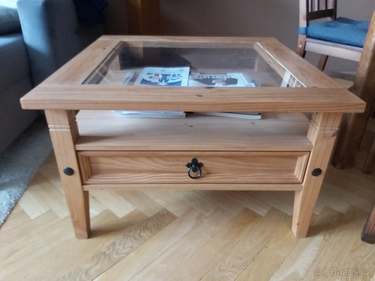 Prodám hezký, pevný, konferenční stolek se zasuvkou. Ideální na chatu. Rozměr desky: 75x75, výška 45 cm. Horní deska nese drobné znaky užívání, nutno přebrousit. Pouze osobní odběr Kladno, Amálská ulice.