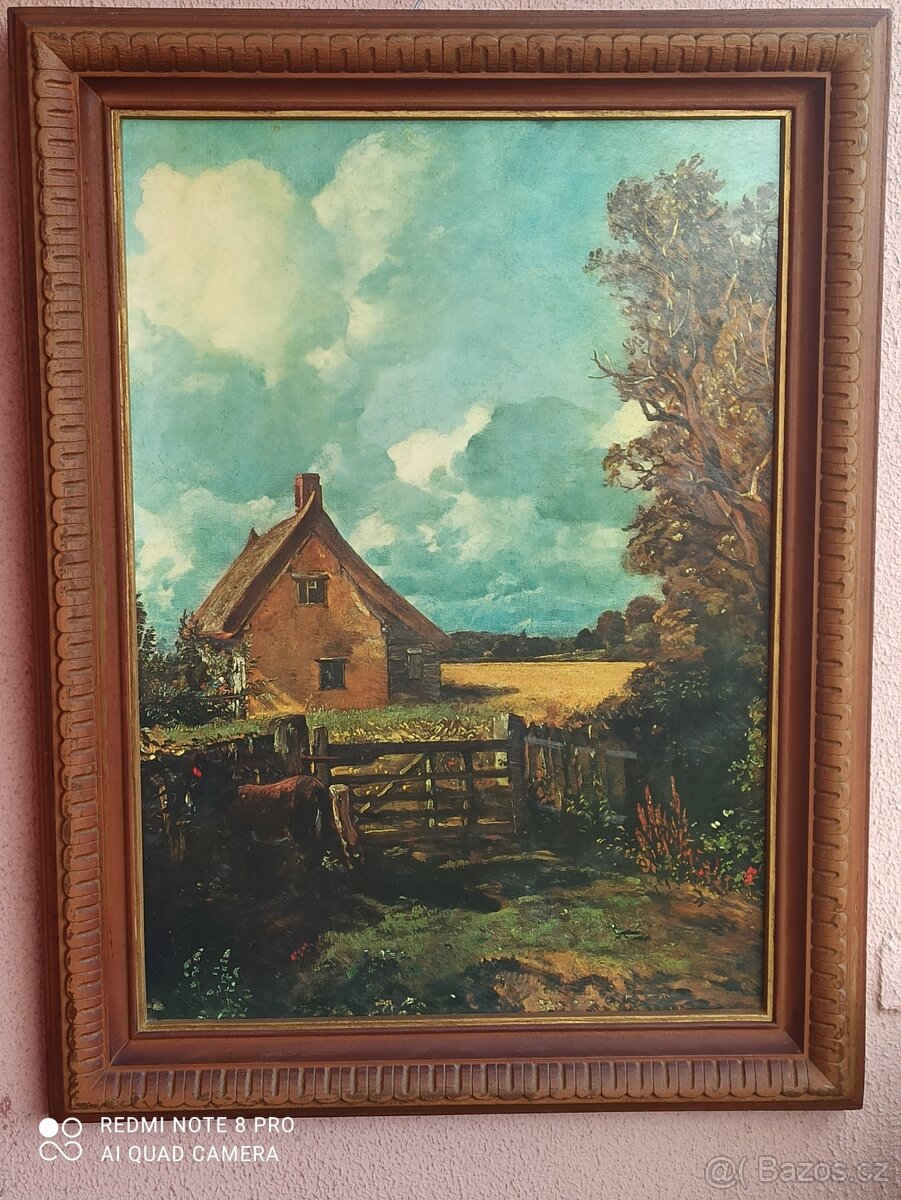 Obrazy v rámech, oba reprodukce, oba výšky 84cm x 64cm, v ceně je i zlaceny ram výšky 90cm x 70cm, velmi zachovalé a nevyužité, pouze jako komplet, cena za komplet.