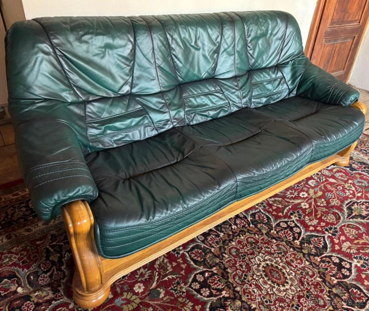 Nabízím k prodeji rustikální koženou sedačku - trojsedák v tmavě zelené barvě.