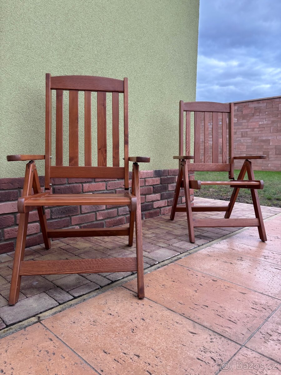 Prodám zánovní polohovací zahradní křesla z lakovaného masivního dřeva. Původní cena 2400.-. Cena za ks.