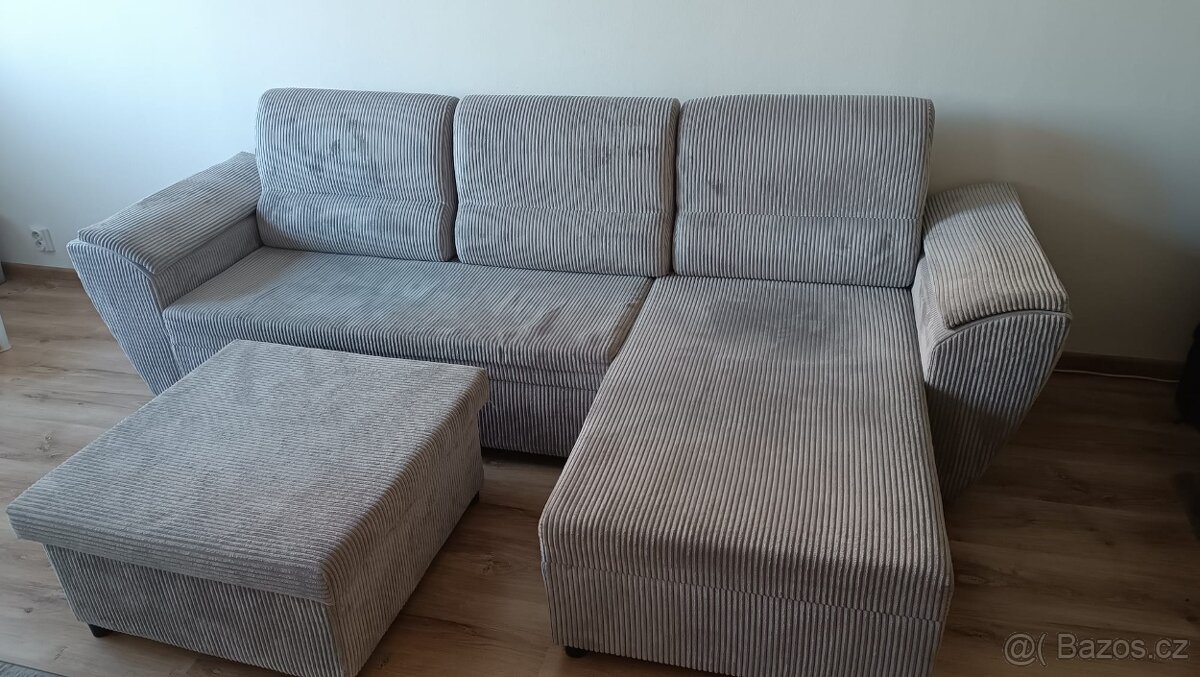 Taburet má také úložný prostor. Delší část(lenoška) sedačky se dá vyměnit na druhou stranu. Sedačka má minimální známky opotřebení. Délka sedačky je 252cm, délka delší strany od polštářů je 112cm a hloubka sedu od polštáře je 50cm, výška od země po sedící plochu je 39cm. Osobní odběr Ostrava