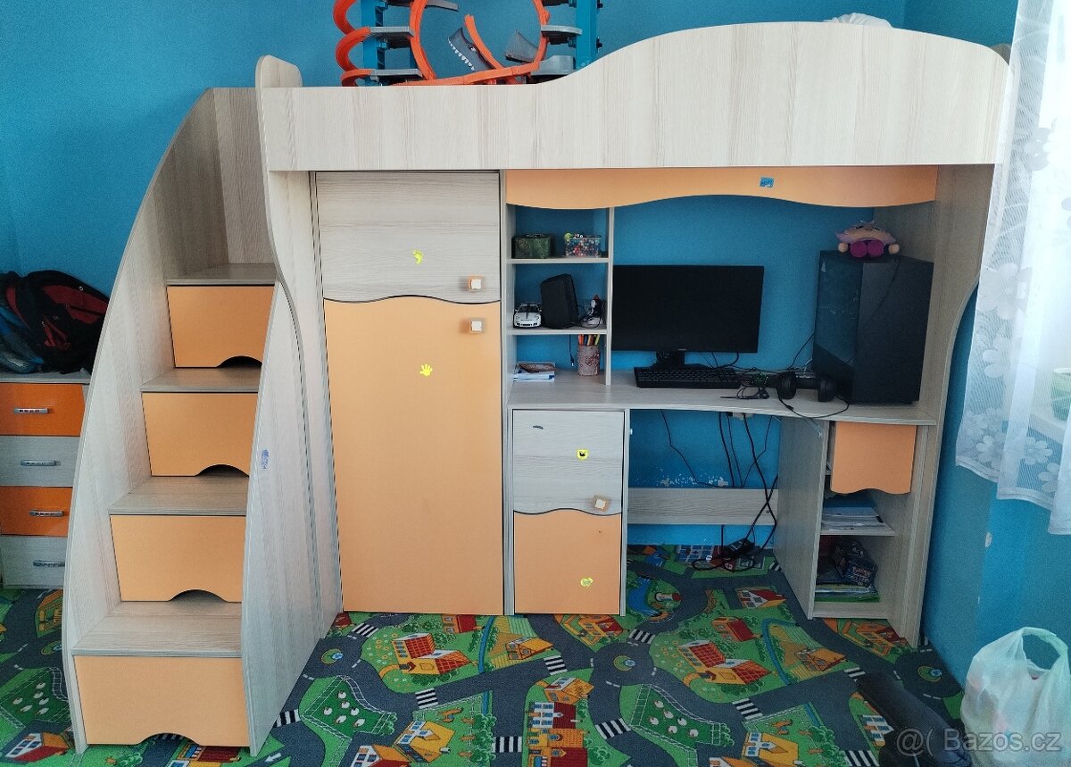 Na posteli syn nespal, využívali jsme jen psací stůl a úložné prostory. Schody mají v sobě šuplíky. Skříň a komoda byly kupované zvlášť, takže oranžová barva není úplně stejná (mat x lesk)