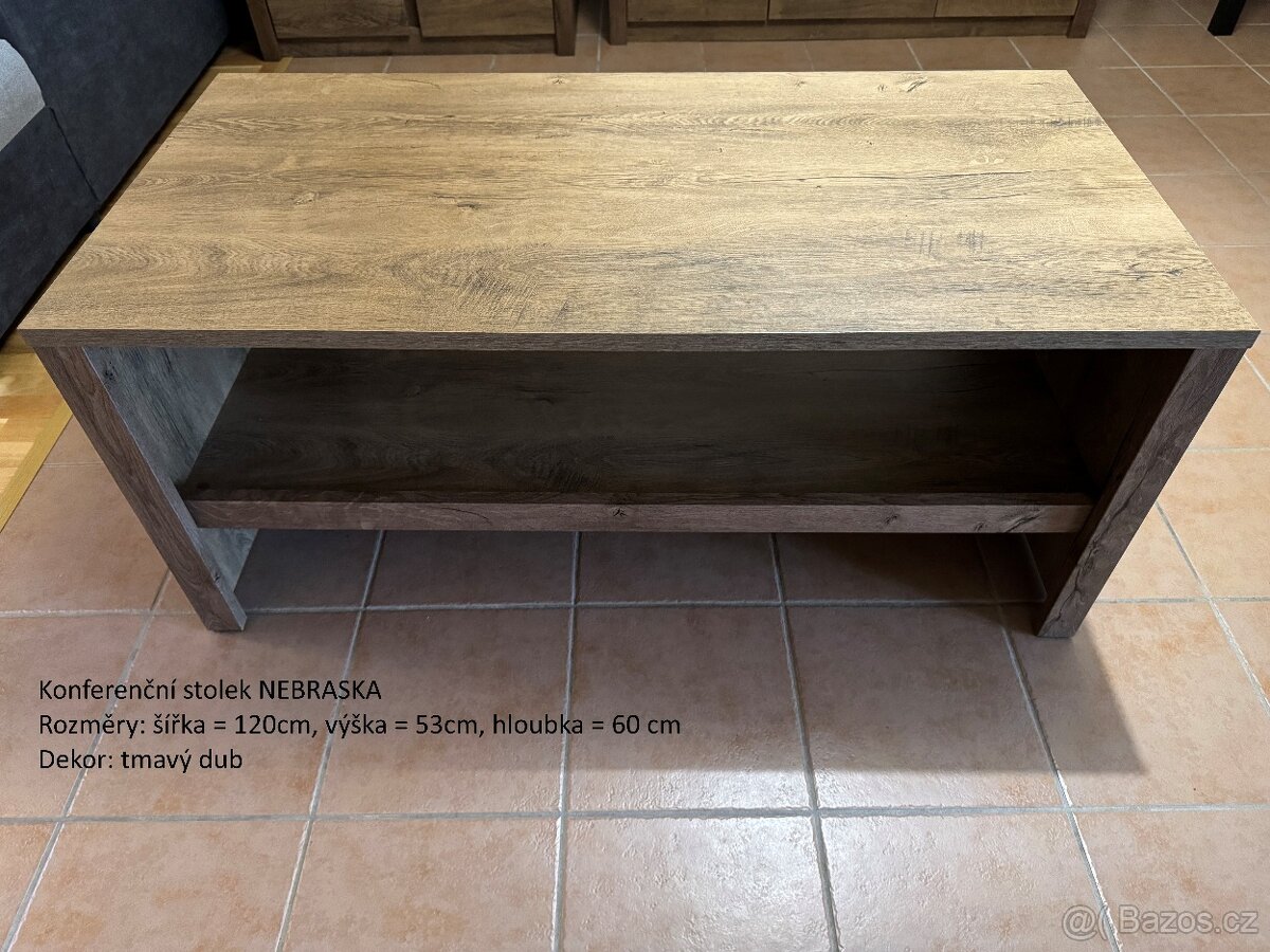 Prodám konferenční stolek Nebraska - tmavý dub - kupovaný v roce 2020 - bez poškození. Rozměry ve fotce. Prodávám i TV stolek, vysokou skříň a komodu Nebraska ve stejném dekoru - tmavý dub - viz. moje další inzeráty. Vše kupováno v KIKA.