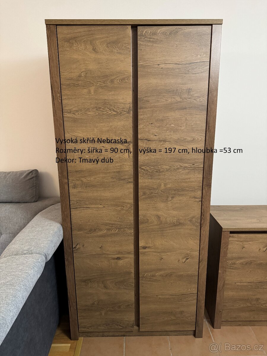 Prodám vysokou skříň Nebraska - tmavý dub - kupovaný v roce 2020 - bez poškození. Rozměry ve fotce. Prodávám i TV stolek, konferenční stolek a komodu Nebraska ve stejném dekoru - tmavý dub - viz. moje další inzeráty. Vše kupováno v KIKA.