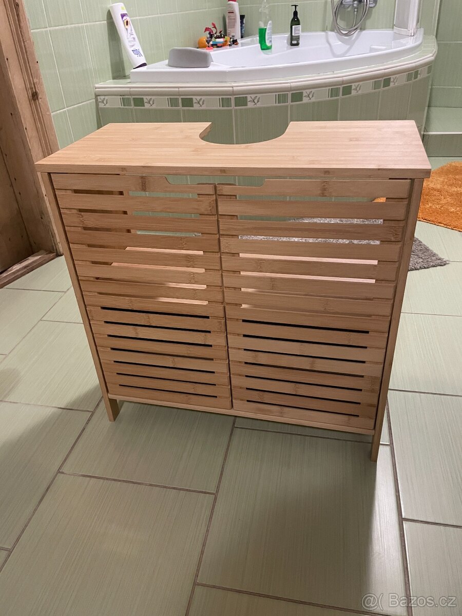 5five skříňka pod umyvadlo, bambusová s lamelovými dvířky v přírodní barvě dřeva. Výška 60 cm, šířka 60 cm, hloubka 28 cm. Bezvadný stav.