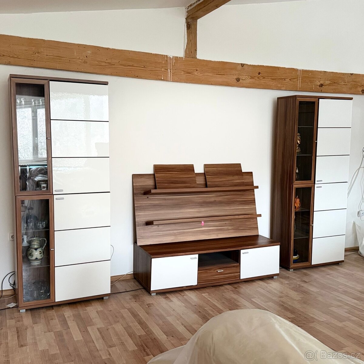 Prodám moderní a velmi krásnou a zachovalou obývací stěnu, stolek pod tv a poličky.