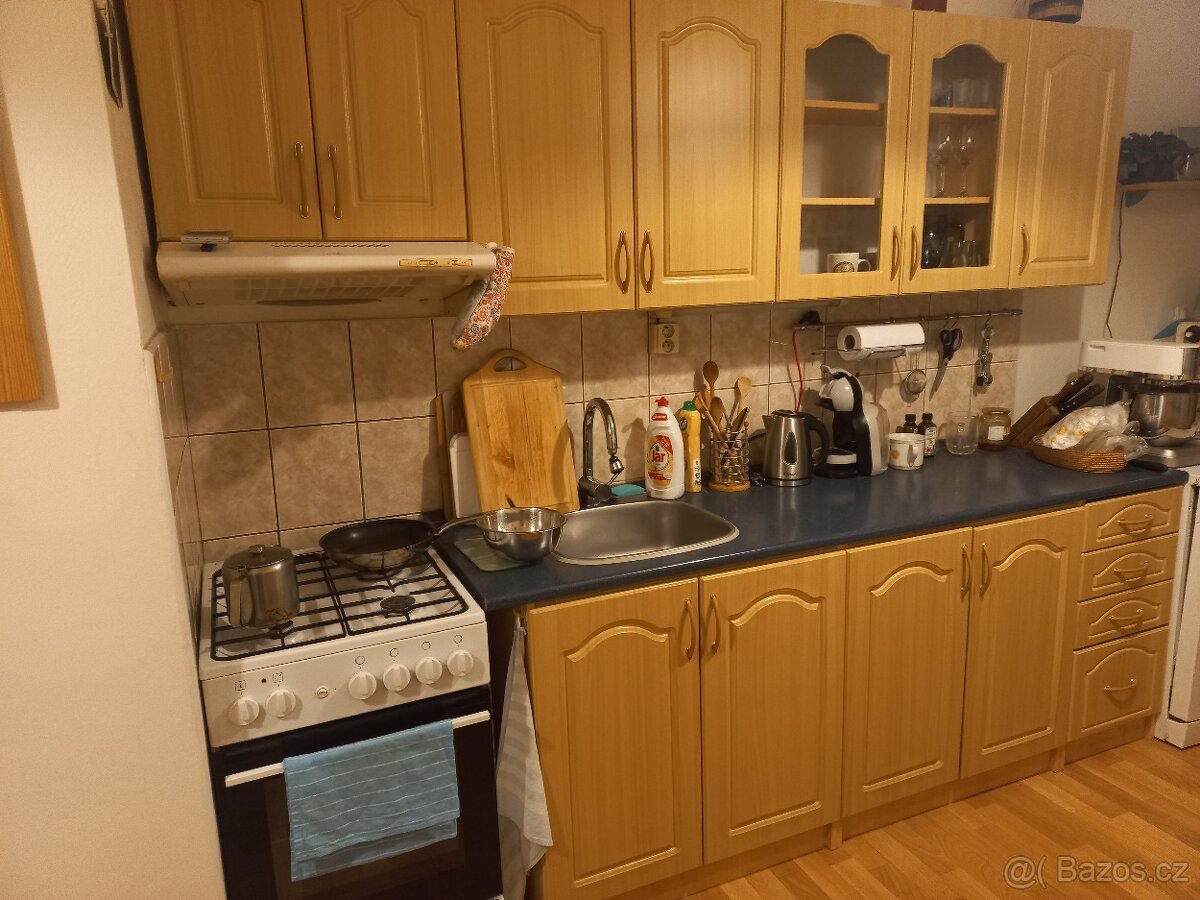 Prodám kuchyňskou linku včetně dřezu a sporáku s el. troubou. Spodní skříňky 2m , horní 2,6m.