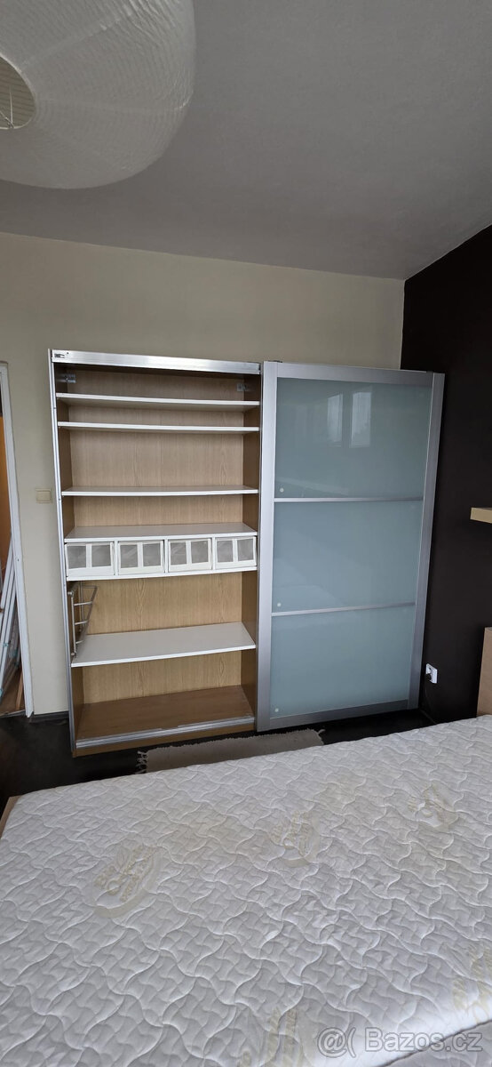 Prodám velkou šatní skříň Ikea. Rozměr 200x200x40cm. Dveře posuvné - matný hliník a mléčné sklo. Boky - dekor dřeva dub.