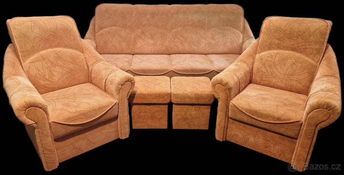Prodám rozkládací sedací soupravu, dvě křesla a dva taburety.