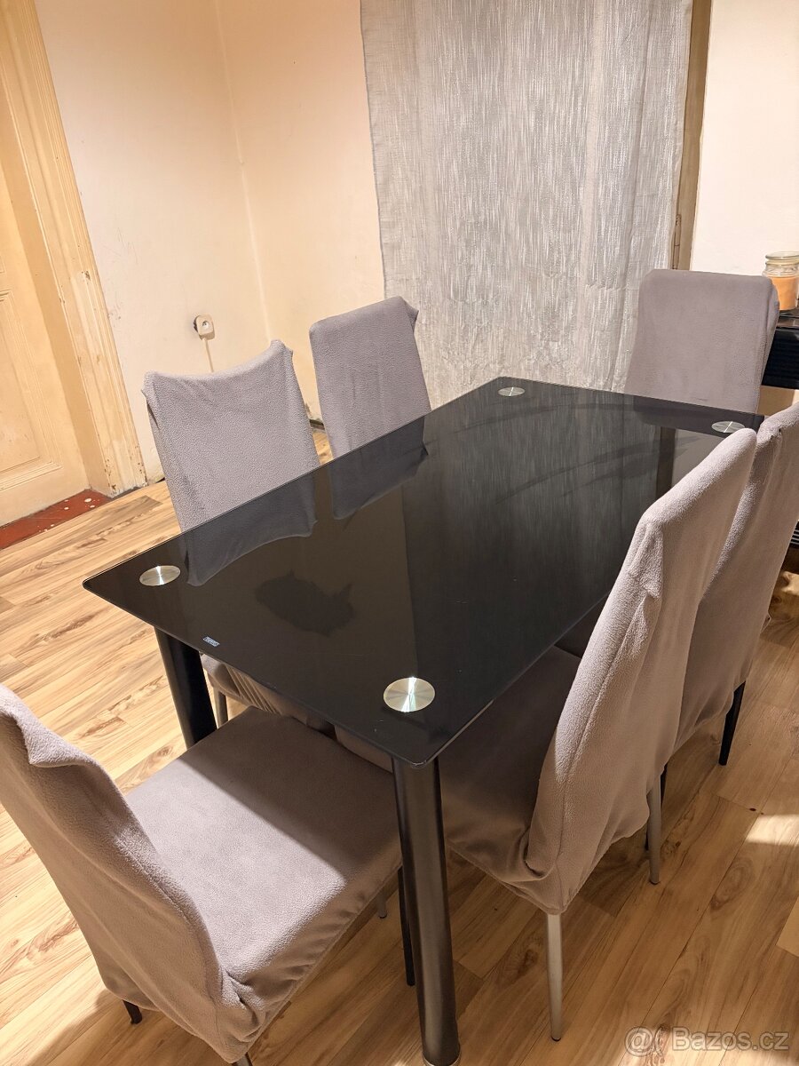 Prodám skleněný jídelní stůl, normální známky používání. K tomu nechám židle, použitelné pouze s potahy nebo např. na zahradu.