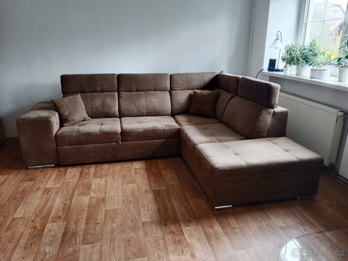 Sedací souprava rozkládácí s úložným prostorem a dvěma "bobky" k posezení. Materiál mikroplyš.
