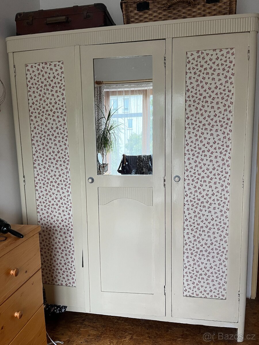 Třídveřová šatní skříň se zrcadlem. Zrenovovaná, dřevěný masiv, látkový potah ve výplni. Rozměr v cm: š.150, v.195, hl.50