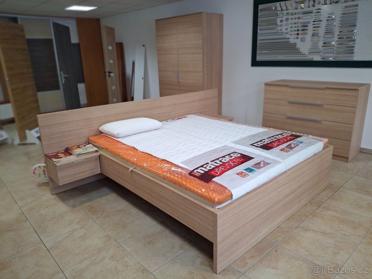 Prodám nepoužitý nábytek vystavený na prodejně dvojlůžko na matrace 90*200cm, komoda š130*v100*h62cm, šatní skříň š130*v217*h62cm.Postel ve spodní části poškozena vodou. Cena bez matrací a roštů celkem 8000Kč. Rošty možno dokoupit za cenu 2000Kč.