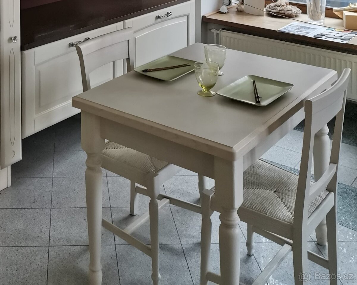 Prodám krásný masivní designový italský rozkládací jídelní stůl se dvěma celomasivními židlemi s výpletem. Nohy stolu a hrany desky ze stejného masivu jako židle, horní část praktické omyvatelné lamino.Rozměry stolu 100x 70 cm, rozložený 140 x 70cm. Top stav, původní cena 23.000 Kč, nyní nabízím vše za 6900 Kč.