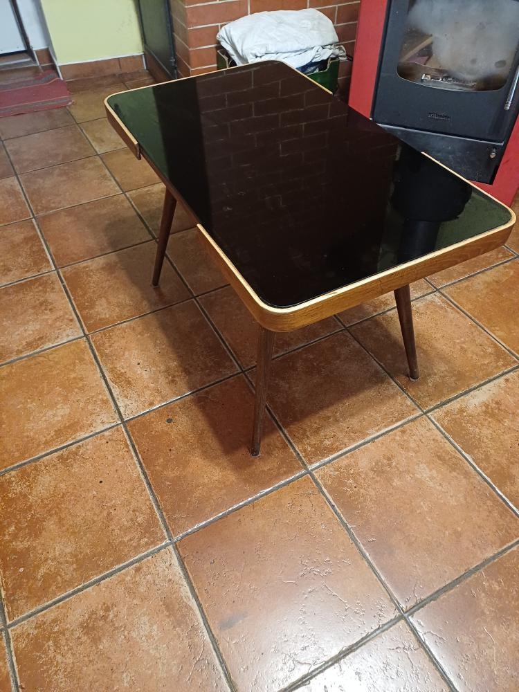 Prodám konferenční stolek s černým sklem z 70. – 80. let, plocha 88 x 50 x 55