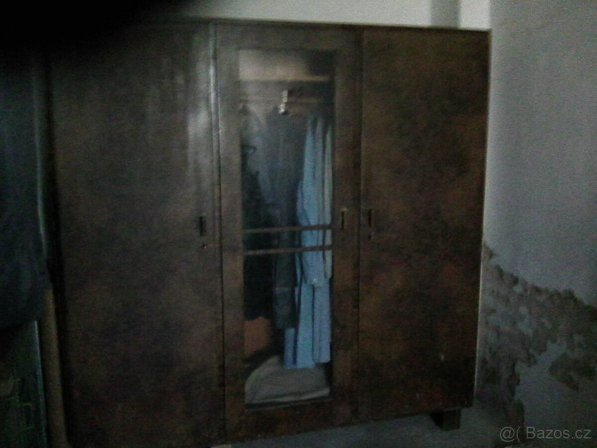 Prodám (i jednotlivě) "RETRO" funkční třídveřovou skříň. Vnější rozměry: výška 179 cm, šířka 175,5 cm, hloubka 52 cm. Vybavení skříně: v levé části 4 police za uzamykatelnými dveřmi. Ve střední a pravé části tyč na ramínka, nad ní police, za tyčí na zadní stěně 7 věšáků. Vše opět za uzamykatelnými dveřmi. Prostřední dveře jsou celé prosklené. Skříň je celodřevěná. Cena za skříň - 1500,-Kč. Dále prodám "RETRO" funkční dřevěnou postel se třemi matracemi. Rozměry: Délka 186 cm, šířka 94 cm, výška pelesti 47 cm, výška čel postele 122 cm a 94,5 cm. Cena za postel - 500,-Kč. Možno přikoupit ještě další 3ks matrací (rozměry 90 x 60 x 16 cm) za cenu 50,-Kč/ks. Platí do smazání inzerátu.