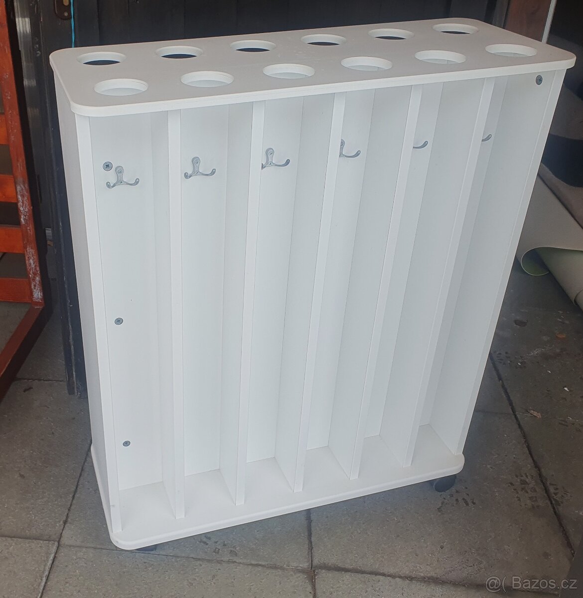 Prodám 2 kusy koupelnových vozíků obsahující prostory na ručníky a otvory na pohárky pro 12 dětí. Každá přihrádka obsahuje jeden dvojitý věšáček na zavěšení ručníku.