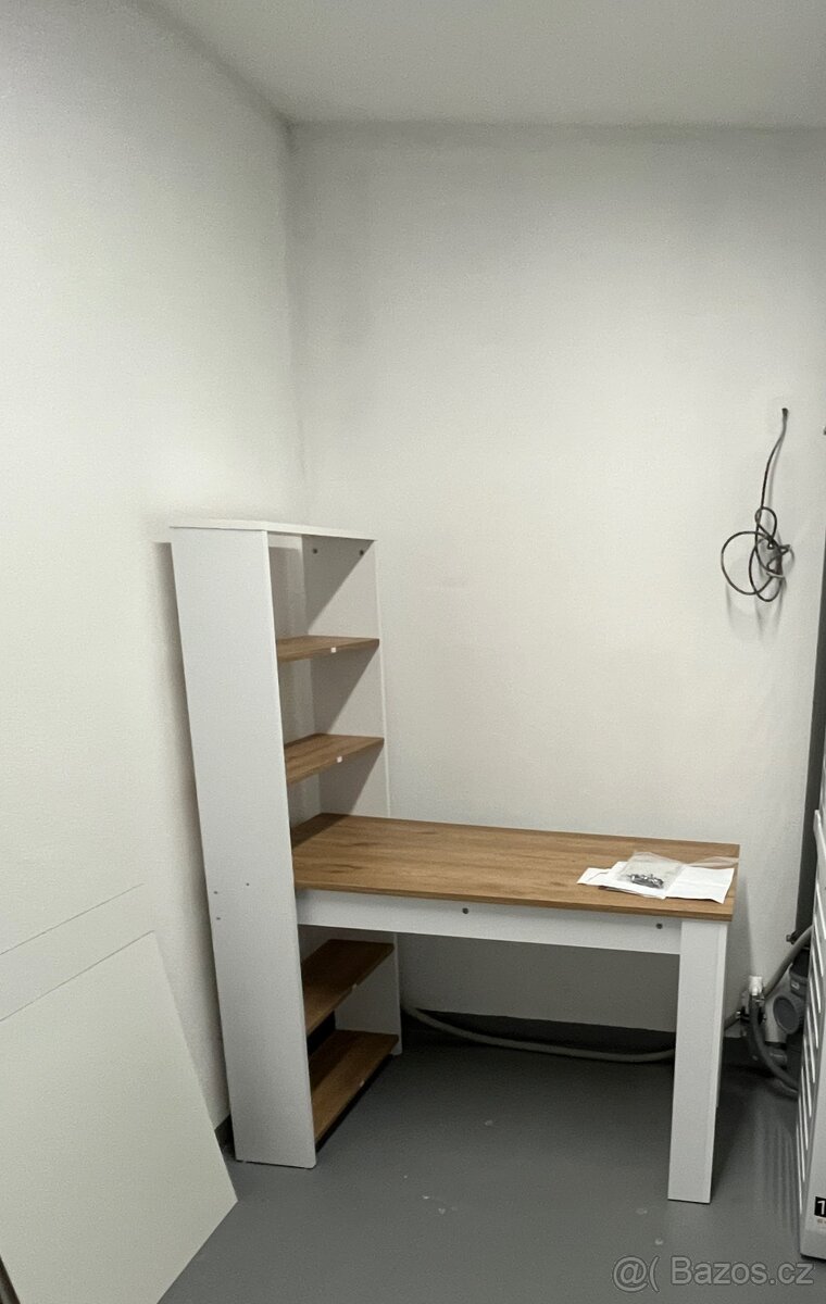 Prodám stůl s policemi v kombinaci barev bílá a dřevěný dekor. Využití jak pracovní, tak psací a jídelní. Rozměry jsou uvedeny na jedné z fotografií. Zakoupen a smontován před 4 měsíci, opotřeben minimálně. K odběru na Bělově u Otrokovic, mohu demontovat.