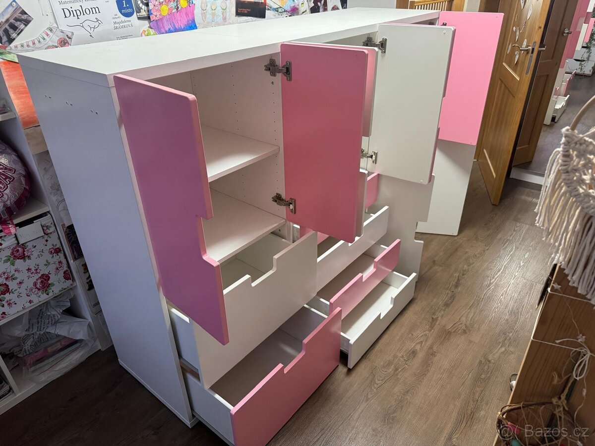 Dětská růžovo bílá skříň, 180 cm dlouhá a 130 cm vysoká, nepoškozená