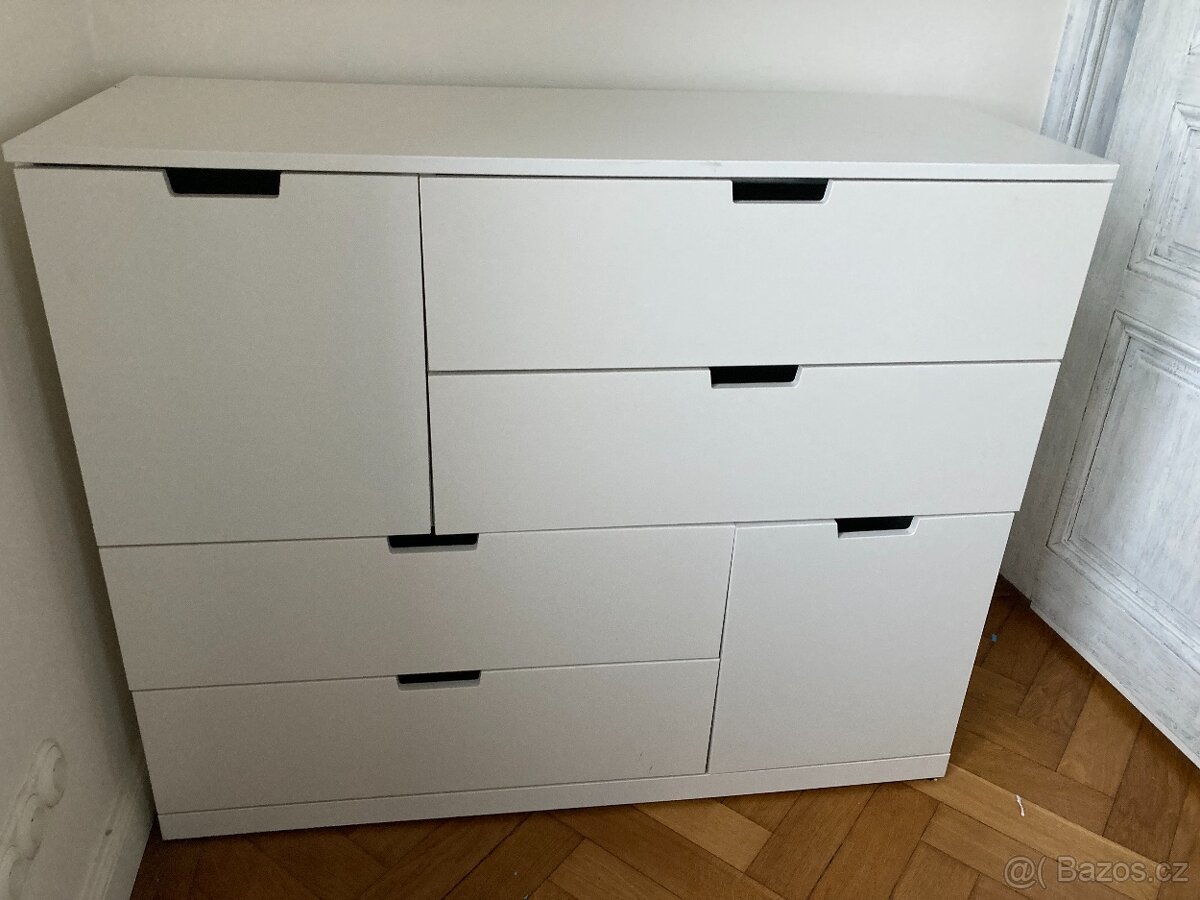 Nabízíme zánovní komodu. V jednom šuplíku je lehce prověšené dno, ale funkčnosti to nebrání. Horní zadní levý roh je mírně odřený. Jinak bez závad. Velký úložný prostor.