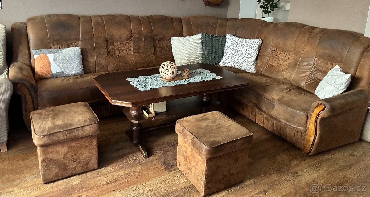 Kombinace dřeva a látky ve stylu broušené kůže. nutno vidět, je třeba snést z prvního patra v rodinném domě, používala babička. Nevykazuje známky většího poškození. Rozkládací. Rozměry na fotografii příp. po telefonu. Orlová. Cena je k jednání, není dogma.