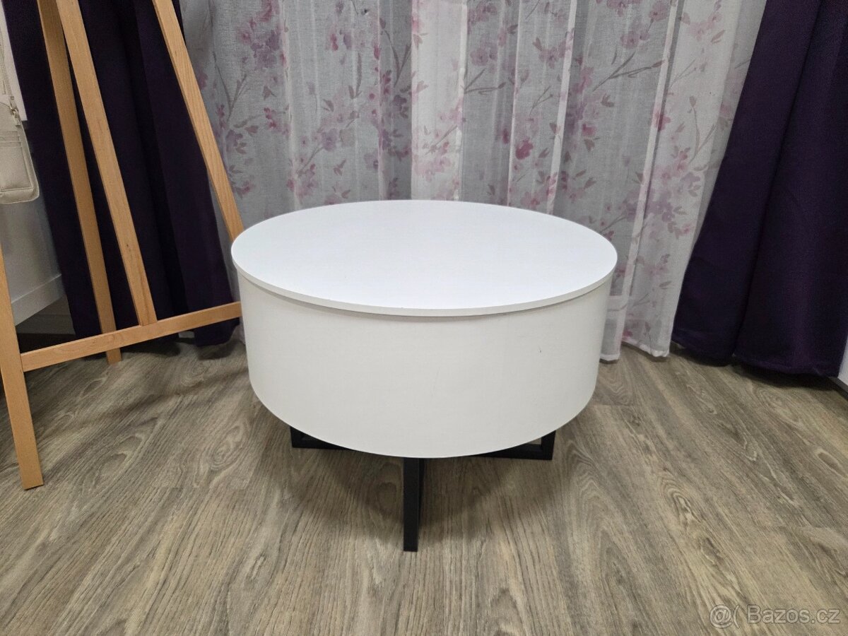 Konferenční stolek otevírací. Výška 50cm, průměr 70cm.