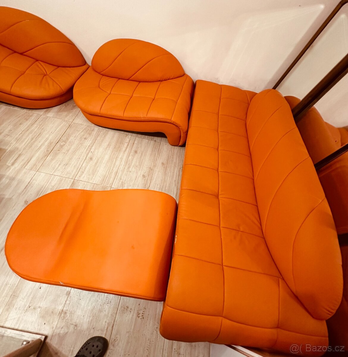 Sedací souprava oranžová. Místy se lehoučce olupuje, ale na chalupu, do klubovny, garáže ideální.