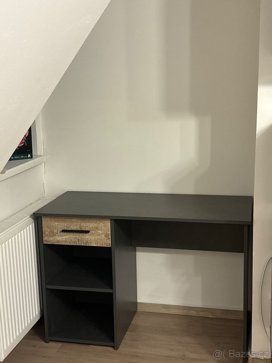 Industriální psací stůl s regálem (dub/černá) - 120 cm - [11.2. 2026]Prodám stylový a velmi praktický psací stůl v industriálním/loftovém designu. Stůl je ideální pro práci z domova nebo pro studenty, díky integrovanému regálu nabízí dostatek místa na organizaci věcí, aniž by zabíral příliš prostoru v místnosti.