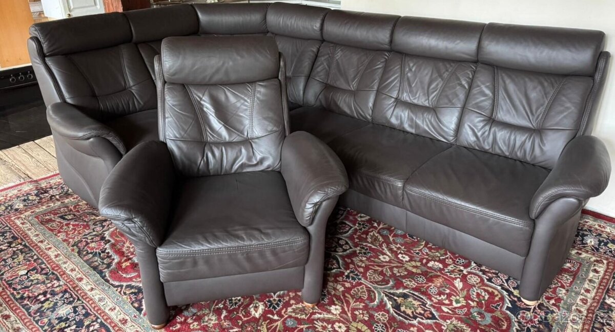 Nabízím k prodeji koženou rohovou sedací soupravu s křeslem, v tmavě hnědé barvě.