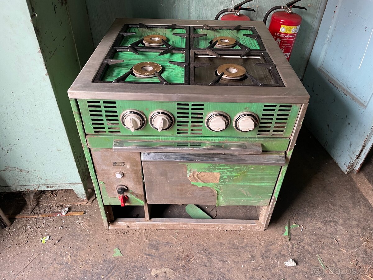 průmyslový plynový sporák s troubou, určený pravděpodobně pro profesionální kuchyně nebo provozovny (např. školní jídelny, tábory, závodní jídelny, atd..) nikdy nepoužité, ještě opatřeno ochranou zelenou folií