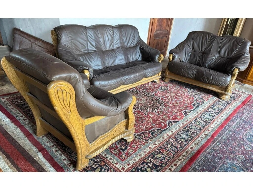 Sedačka je v kombinaci hnědé barvy se světlým dřevem.