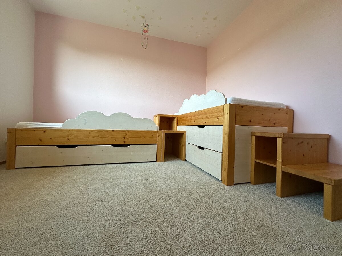 Prodám dětské postele, matrace mají velikost 80/180 cm a jsou v super stavu. Postele jsou ze smrkového dřeva dělané na míru od truhláře. K postelím jsou schůdky a noční stolek. Postele jsou vyrobené v roce 2019. Jsou v dobrém stavu, mají pouze drobné oděrky vlivem používání. Pod postelemi je úložný prostor v hlubokých šuplících. Rošt je tvořen prkýnky.
