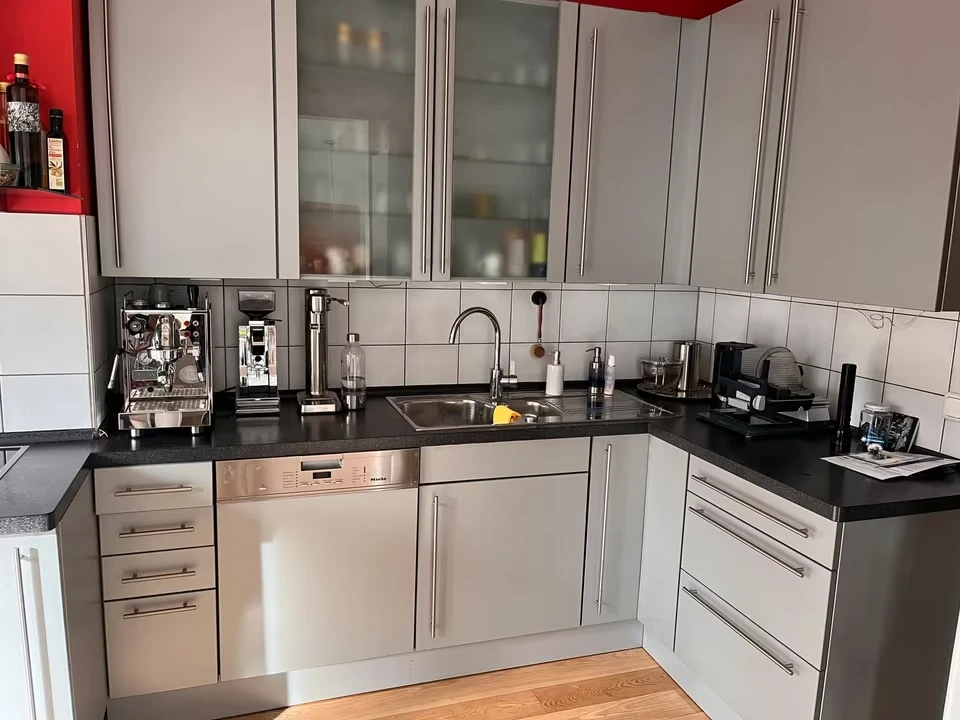 Moderní kuchyně, bez zobrazených spotřebičů, v ceně dodáme tyto spotřebiče: varný set (troubu + varnou desku), digestoř, myčku.