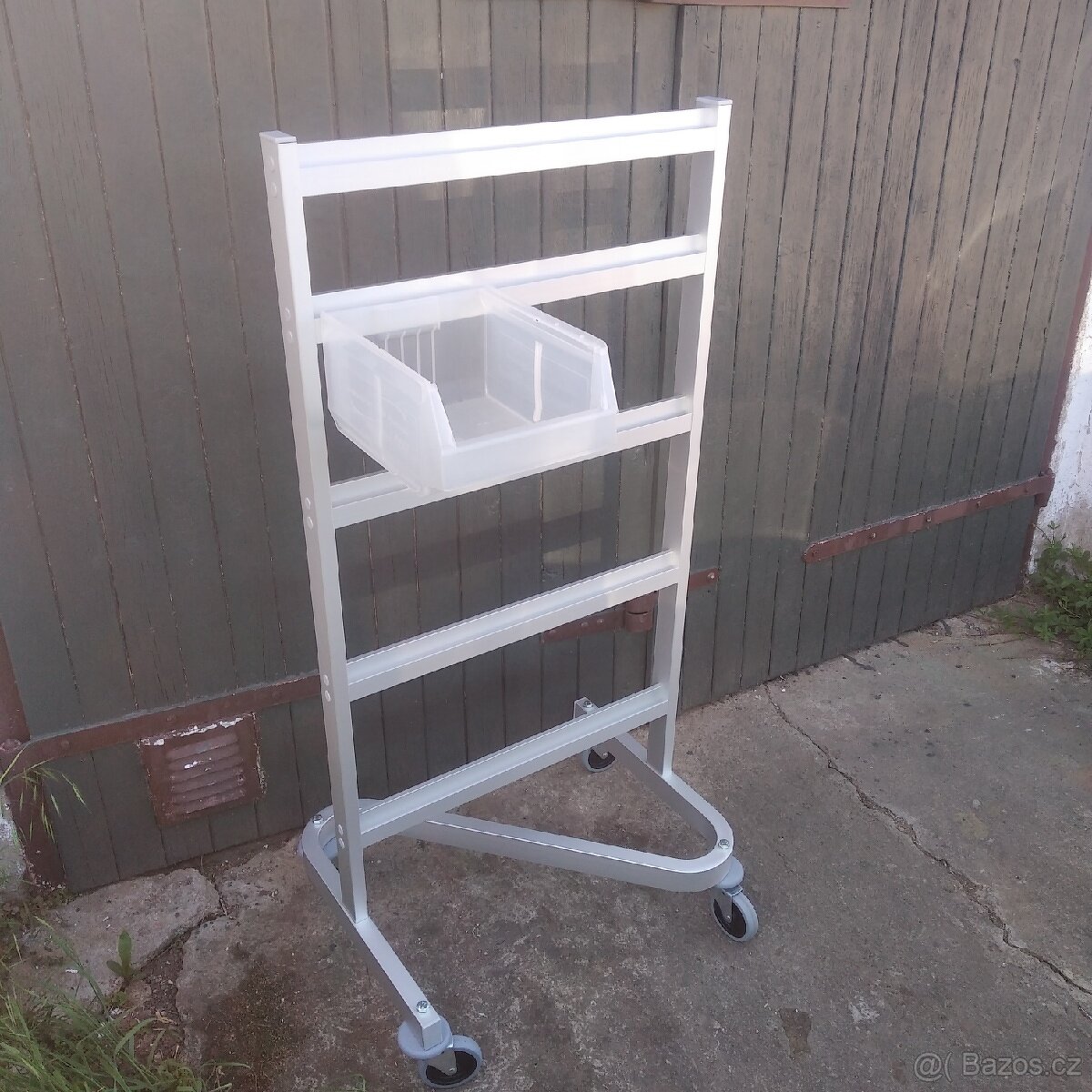 Výška celkem 138cm s toho pojezd 18cm. Lze rozmontovat. Šíře 66cm ,hloubka pojezdu 52cm. 5 přihrádek na závěsné boxy viz foto.lze použít z obou stran. Boxy nejsou součástí, jen pro ilustraci. Možno odstranit přihrádky a upravit na stojan na oblečení.