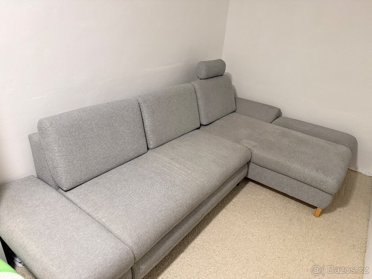 Rozkládací sedačka šedé barvy. Celkova šířka 280cm hloubka 90cm a dlouha sedaci plocha 160cm. Šedá barva