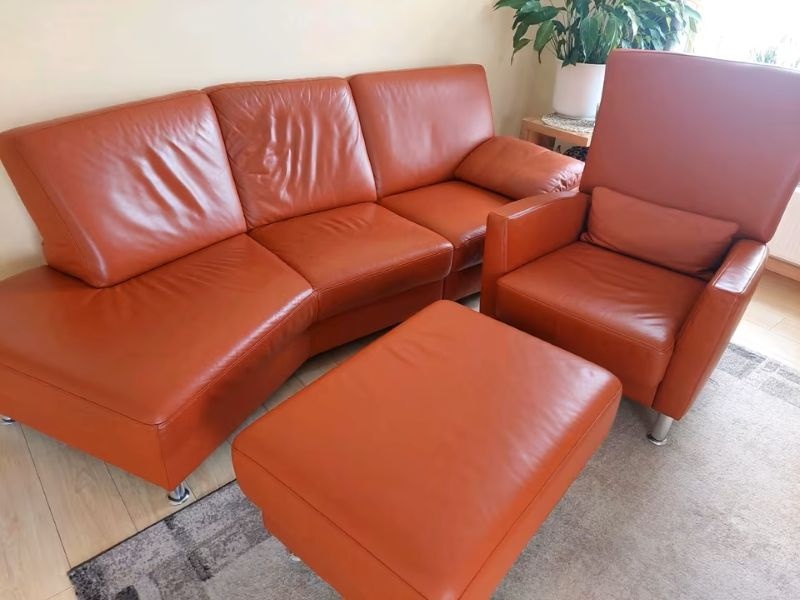 Sedací souprava kožená 3+1+taburet - pěkný stav. Vysoce kvalitní značka Schillig, červenohnědá kůže, nepoškozená, chromované nohy, k vyzvednutí od začátku dubna. Pohovka má délku 230cm, hloubku 80 až 110cm a výšku 85cm. Křeslo má šířku 80cm, hloubku 80cm a výšku 100cm. Taburet 80x60x40 cm. Bližší informace na telefonu, nebo na email. Nekuřácká domácnost, bez domácích mazlíčků. Zajišťujeme dopravu po celé ČR (cena dopravy dle aktuálního ceníku nafty - počítá se cesta tam i zpět, plus náš čas a amortizace vozidla). Po dohodě i včetně víkendů a svátků. Dále možno na dobírku, nebo osobní odběr v Ústí nad Labem. Výnos u těžkého nábytku si musí každý zákazník zajistit sám, nebo u lehčích věcí zdarma pomůžeme. Doprava zdarma : Ústí nad Labem, Teplice, Bílina, Most, Osek, Litvínov, Duchcov. LEVNÝ NÁBYTEK, LUXUSNÍ NÁBYTEK, KVALITNÍ NÁBYTEK. Nábytek Praha, nábytek Brno, nábytek Litoměřice, nábytek Děčín, nábytek Most, nábytek Chomutov, nábytek Karlovy Vary, nábytek Kladno, nábytek Plzeň.