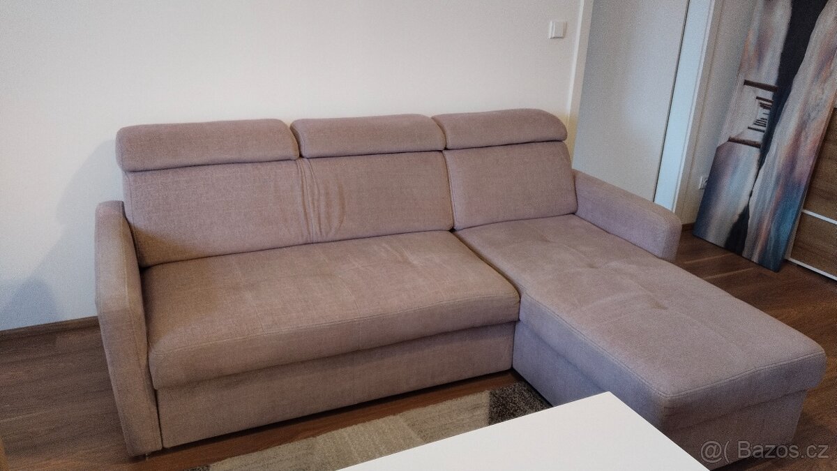 Používaná sedačka, světle růžová/fialová. Rozkládací, úložný prostor. Rozměry 215 cm x 165 cm. Odvoz vlastní Pardubice