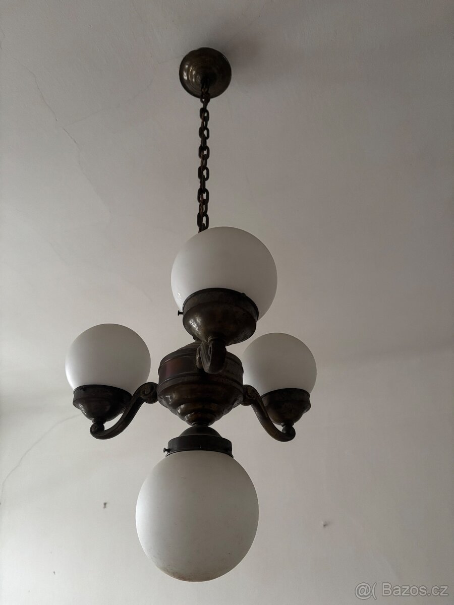 1930-1950. Lustr má kovovou konstrukci s přirozenou patinou a čtyři původní opálové skleněné koule. Zavěšení na řetězu se stropní krytkou. Art deco /funkcionalismus