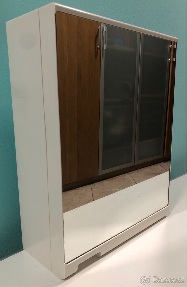 Bílá plastová závěsná skříňka se zrcadlem s magnetickým uzavíráním, ideálně k využití jako praktická domácí lékárnička, běžné opotřebení, rozměry 34,5 x 44,5 x 14,5 cm (š, v, h). 1 pevná a 4 odnímatelný poličky, vestavěné poličky ve dvířkách.