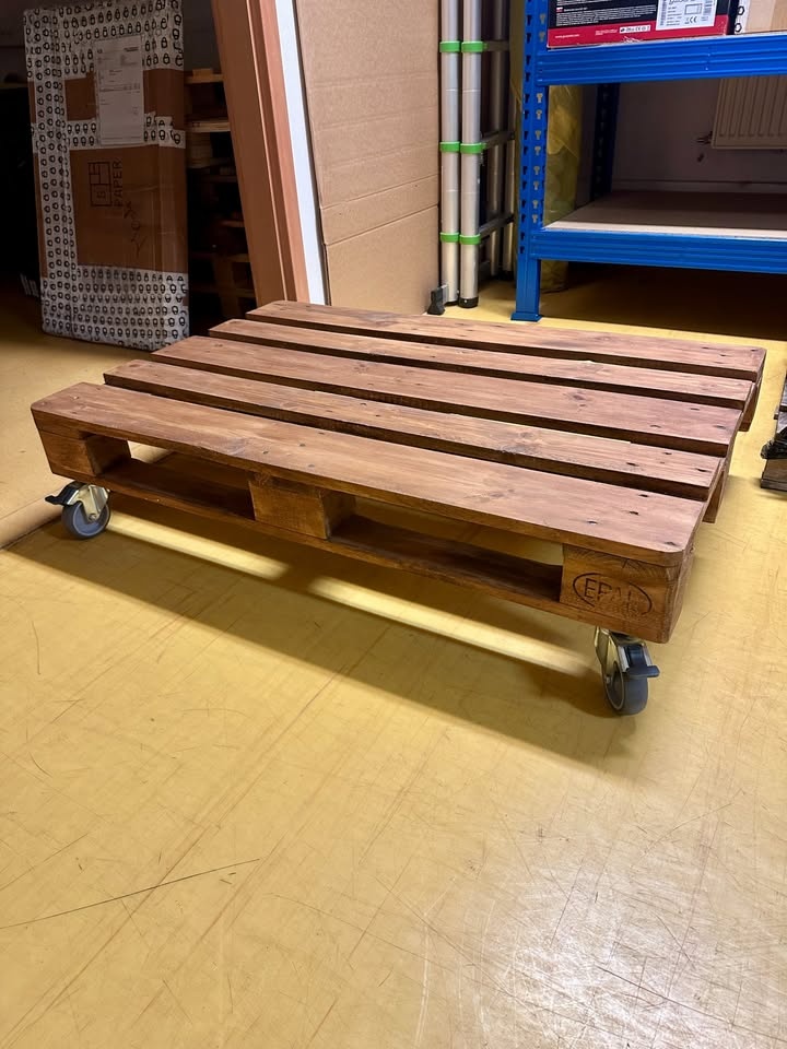 Masivní paletový stolek z EPAL palety. Mořený. Těžký :-) Stolek opatřen kvalitními kolečky s brzdou. Rozměr: 120 x 80 cm. Měli jsme ho v kanceláři, spíše jako dekorativní, je naprosto bez vad. Nutné osobní vyzvednutí na Praze 8.