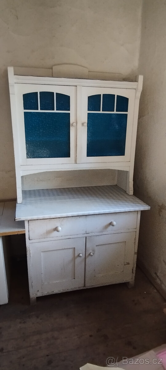Nabízíme k prodeji kuchyňskou skříň- kredenc/příborník pravděpodobně meziválečné období (cca 1920–1940).Natřený bílou barvou, s prosklenou horní skříňkou (modré sklo) a dvěma spodními zásuvkami a dvířky.