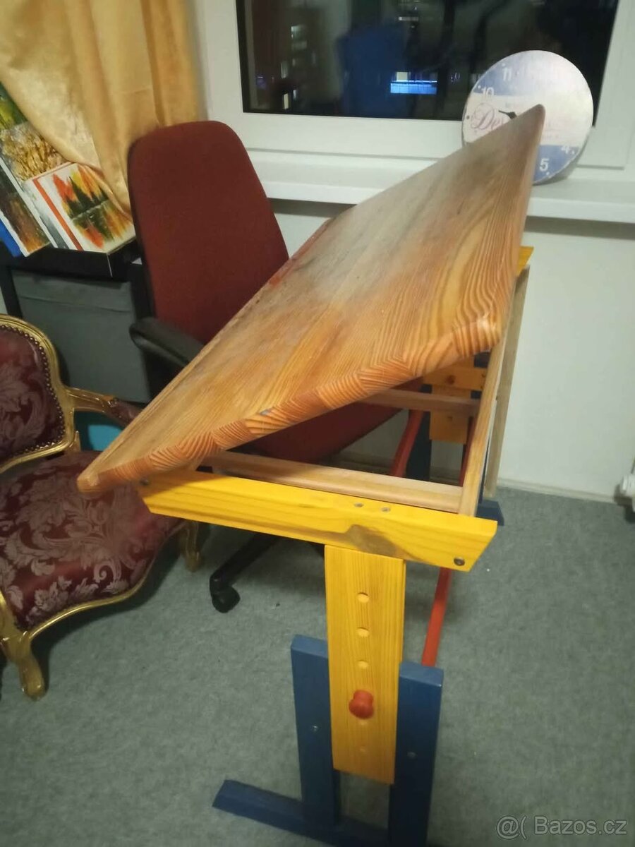 Dětský psací stůl. - [2.2. 2026]Polohovací dětský, dřevěný psací stůl. Rozměr 61x100, výška 66 cm, výšku lze nastavit dle potřeby ( 4 polohy). Osobní odběr.