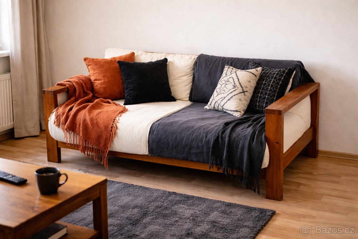 Daruji starší dvoumístnou pohovku s masivním dřevěným rámem včetně sedacích a opěrných béžových polštářů