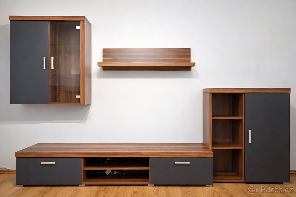 Obývací stěna + konferenční stolek - [15.2. 2026]Prodám obývací stěnu (skříňka s policí, TV stolek, prosklená skříňka, konferenční stolek). Při rychlém jednání sleva.