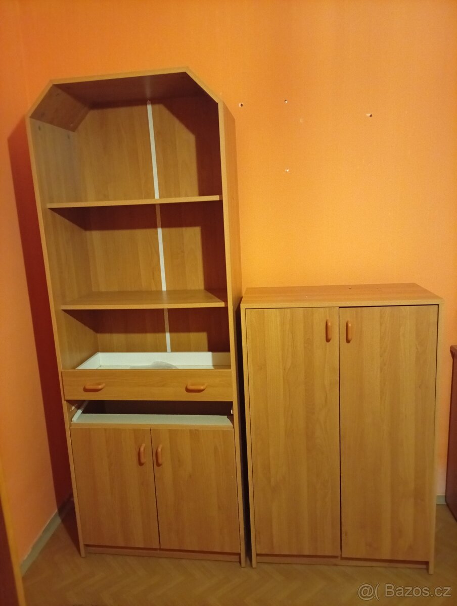 Psací stůl (100x53,5x72,5 cm), počítačový stůl (140x68x96 cm), vysoká skříňka (70x35x190 cm) - nutno opravit kolejničku šuplíku - viz foto, nízká skříňka (70x35x110 cm). Šatní skříň (83x58,5x160 cm), nástavec na šatní skříň (83x58,5x50 cm), skříňka nižší (35x69x118cm), skříňka vyšší (35x69x132 cm). Jídelní stůl 60x90x75 cm. Pouze osobní odběr s vlastní dopravou ve Vřesovicích u Kyjova, nejlépe tento víkend 14-15.2.2026